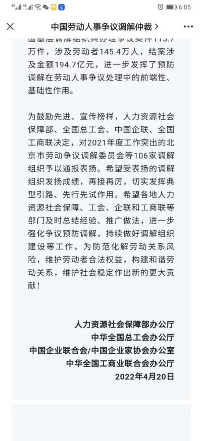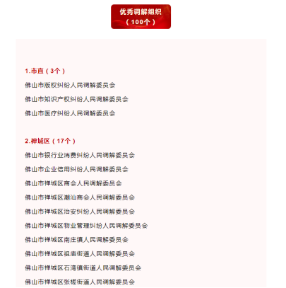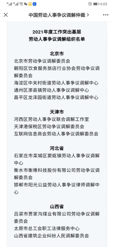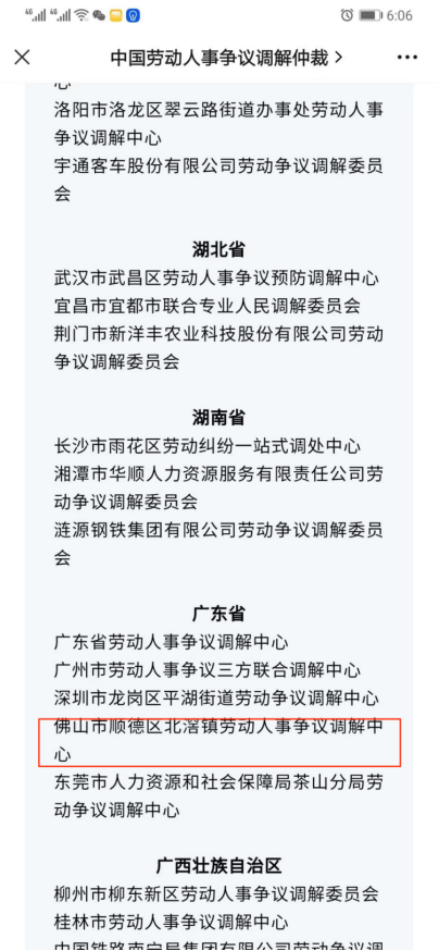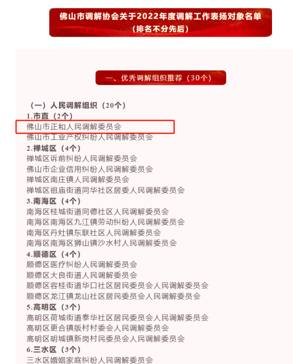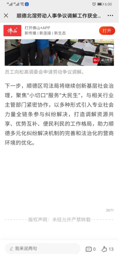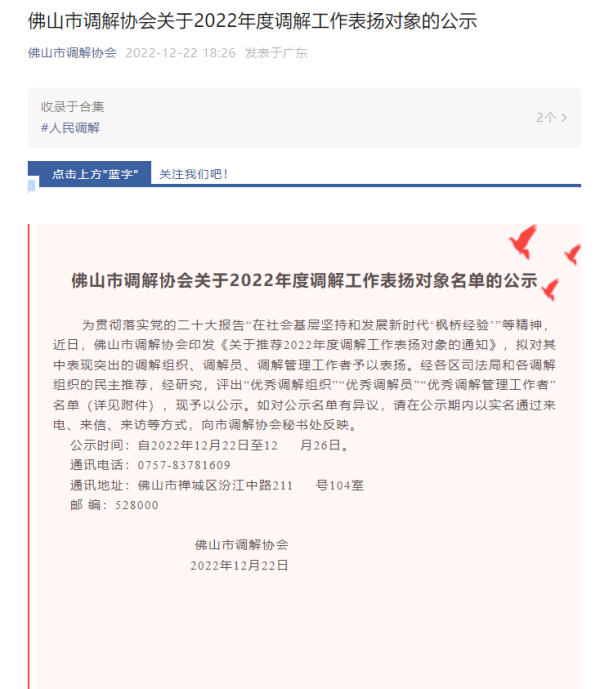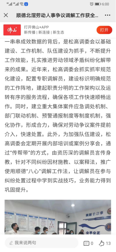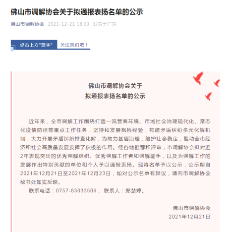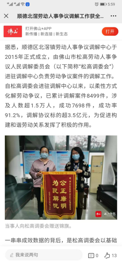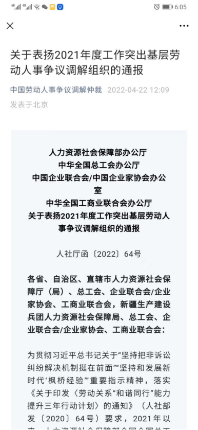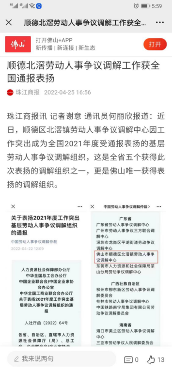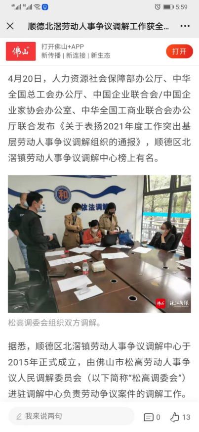 2022年,本中心负责的佛山市顺德区北滘镇劳动人事争议调解工作室获得“全国2021 年度工作突出基层劳动人事争议调解组织”,成为广东省五个获此表扬的调解组织之一”