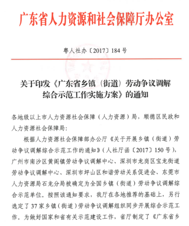 2018年,中心被省人社厅评为顺德区唯一的省级乡镇(街道)劳动争议调解综合示范单位。