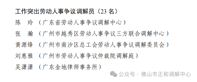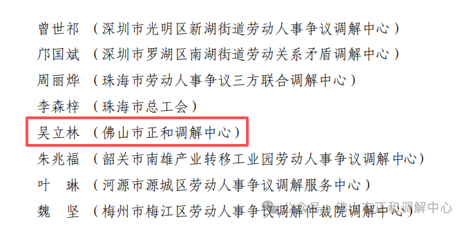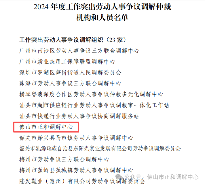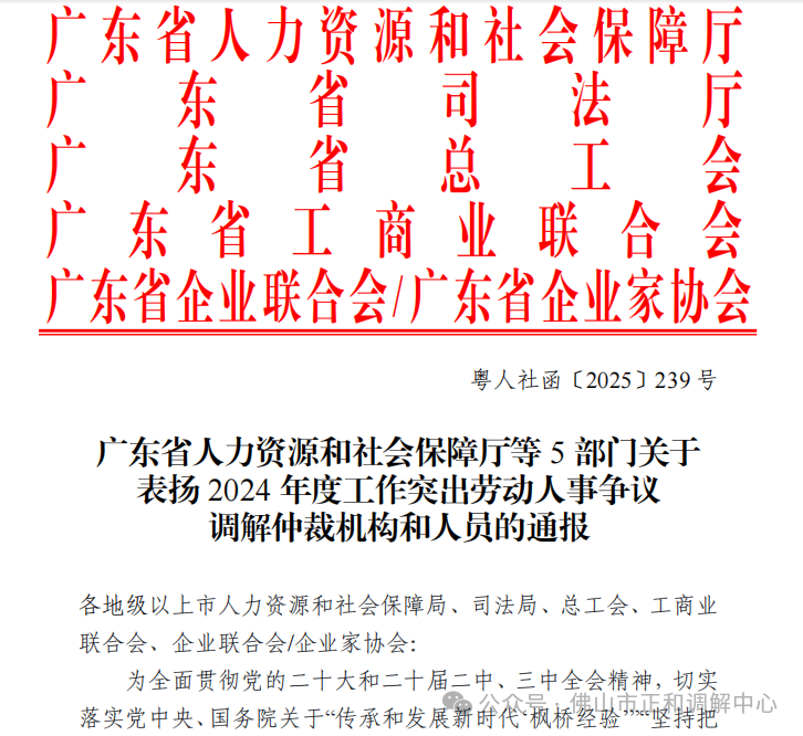 2025年9月9日,广东省人力资源和社会保障厅、省司法厅、省总工会、省工商业联合会、省企业联合会/省企业家协会联合发布《关于表扬2024年度工作突出劳动人事争议调解仲裁机构和人员的通报》(粤人社函〔2025〕239号),对在全省劳动人事争议调解仲裁工作中表现突出的机构和个人予以通报表扬。其中,佛山市正和调解中心荣获“2024年度工作突出劳动人事争议调解组织”称号,中心主任吴立林同时荣获“2024年度工作突出劳动人事争议调解员”称号。